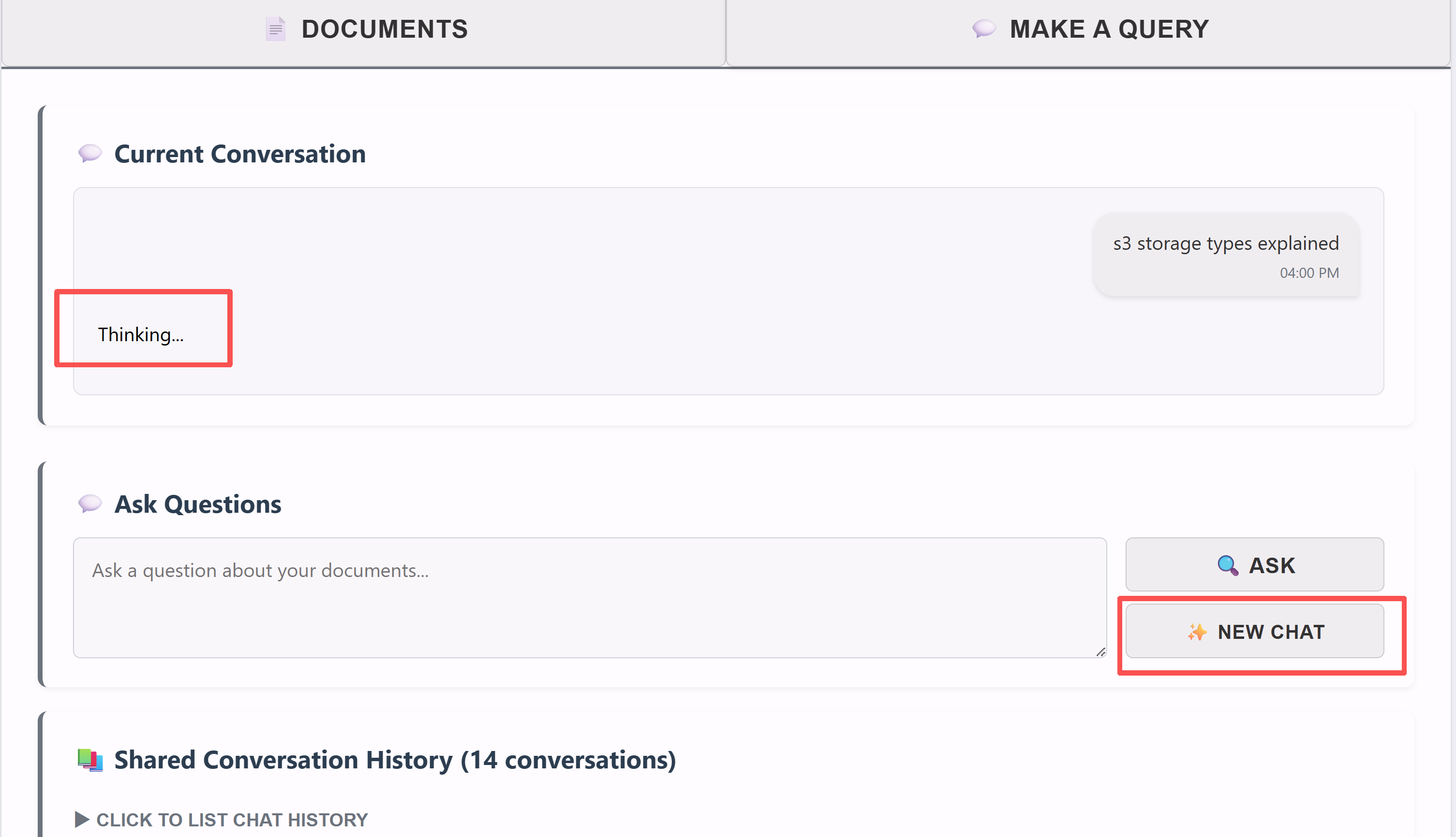 Added aNEW CHATbutton to let users start new conversations while preserving previous threads in Shared Conversation History. The conversation interface was moved to the top of the QUERY tab for better accessibility.