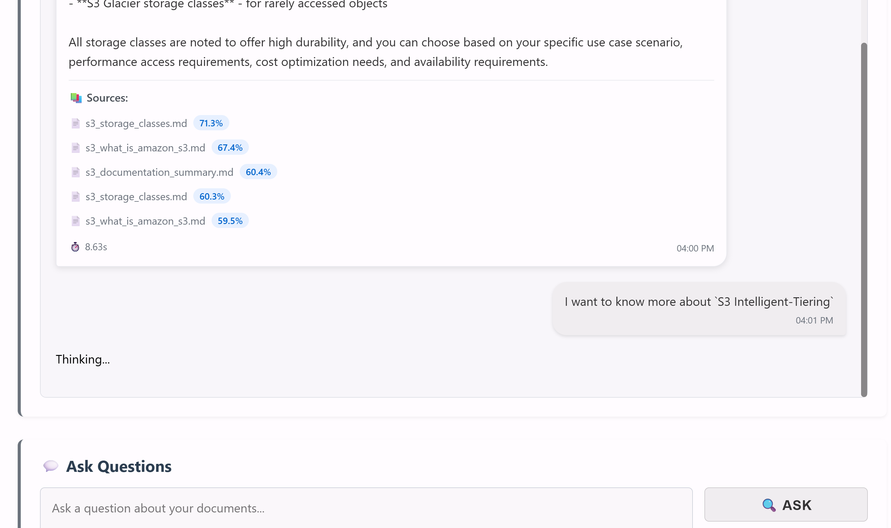 The frontend now supports context-aware conversations and follow-up questions while still displaying source attribution, confidence scores, and execution time.